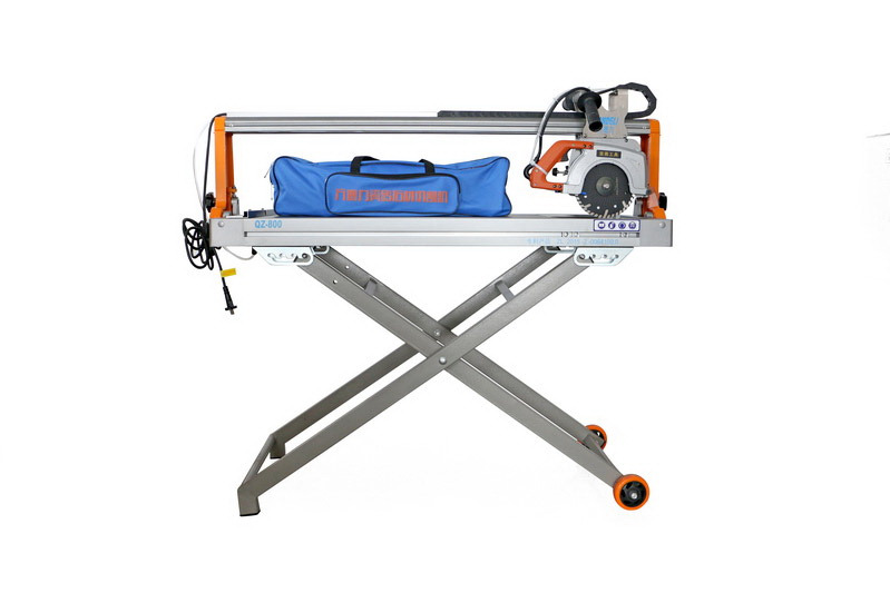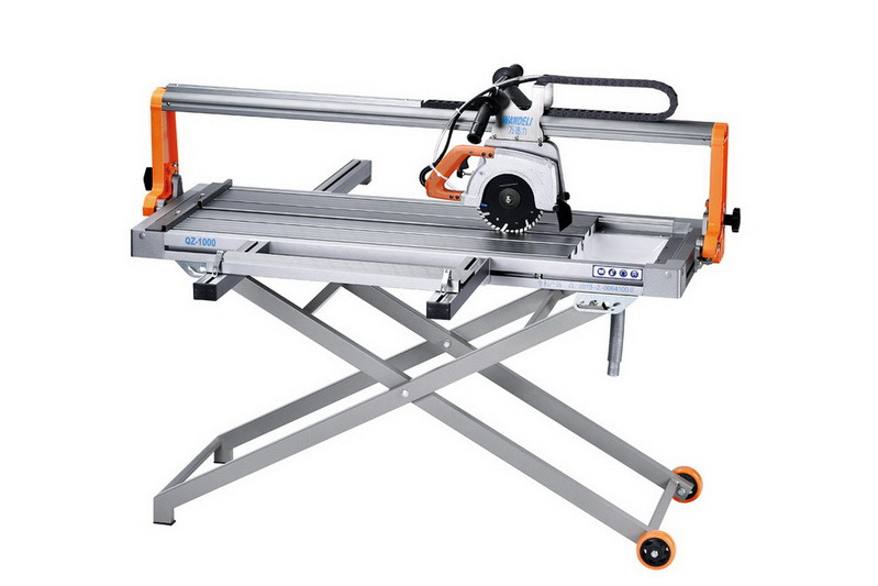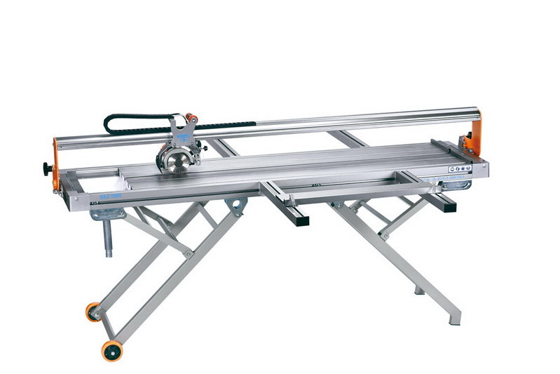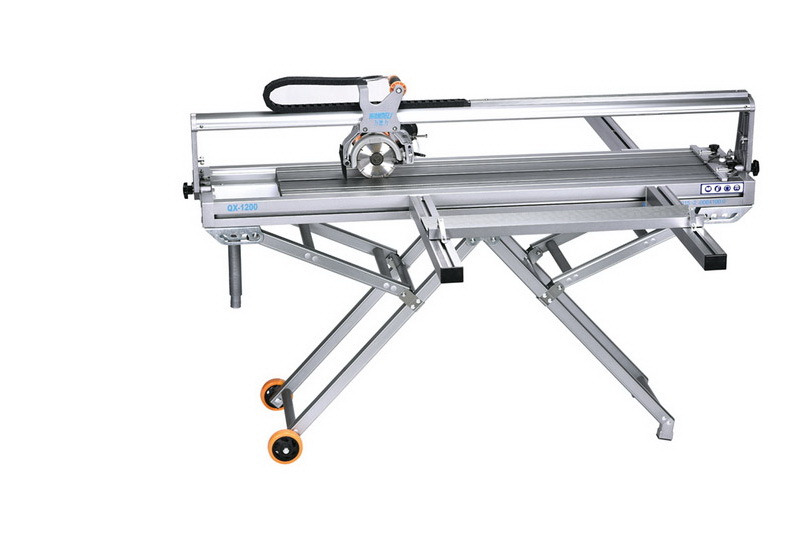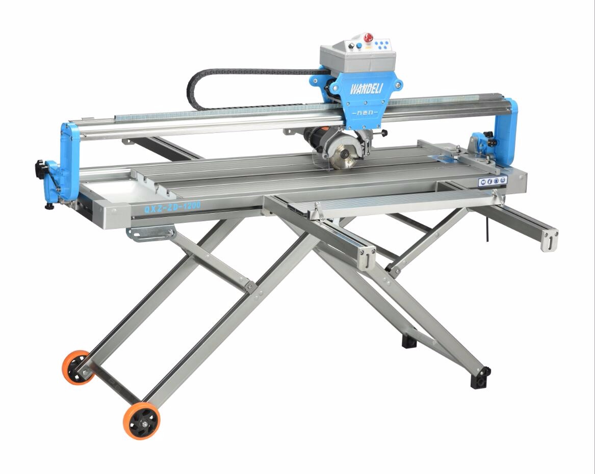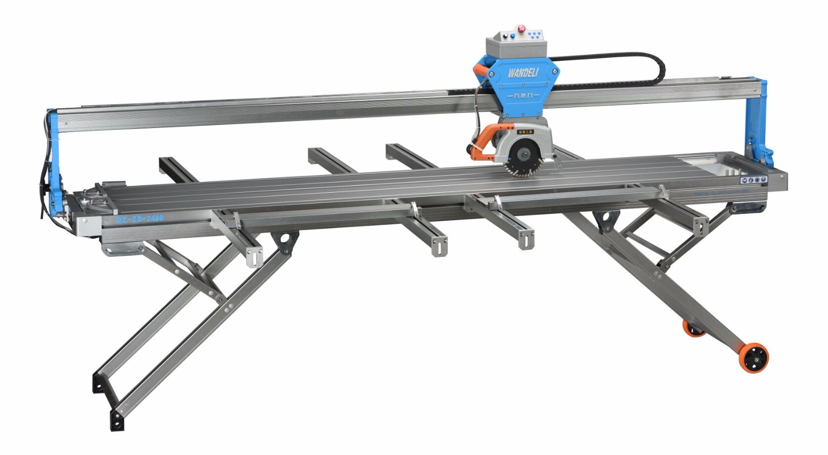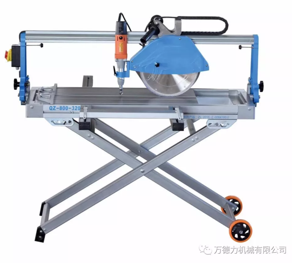 1、切割刀組在石料輸送臺上部并置于機架上,切割刀組之間固定定位導板;切割刀組由電動機、皮帶、刀輪軸、切割刀具組成,切割刀具固定在刀輪軸上